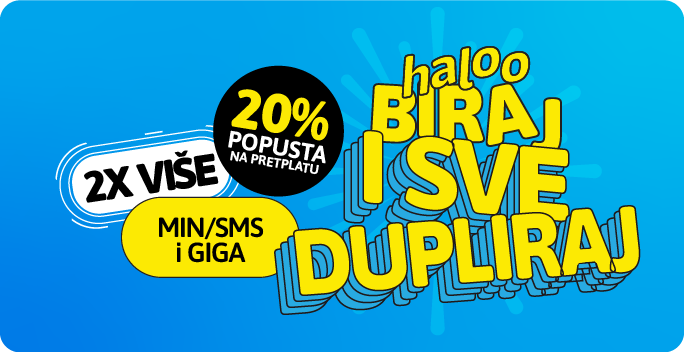 Odaberi svoju haloo tarifu, potpiši ugovor na period od 12 ili 24 mjeseca i dobijaš 20% POPUSTA + DUPLO više MIN/SMS i GIGA tokom trajanja ugovora!